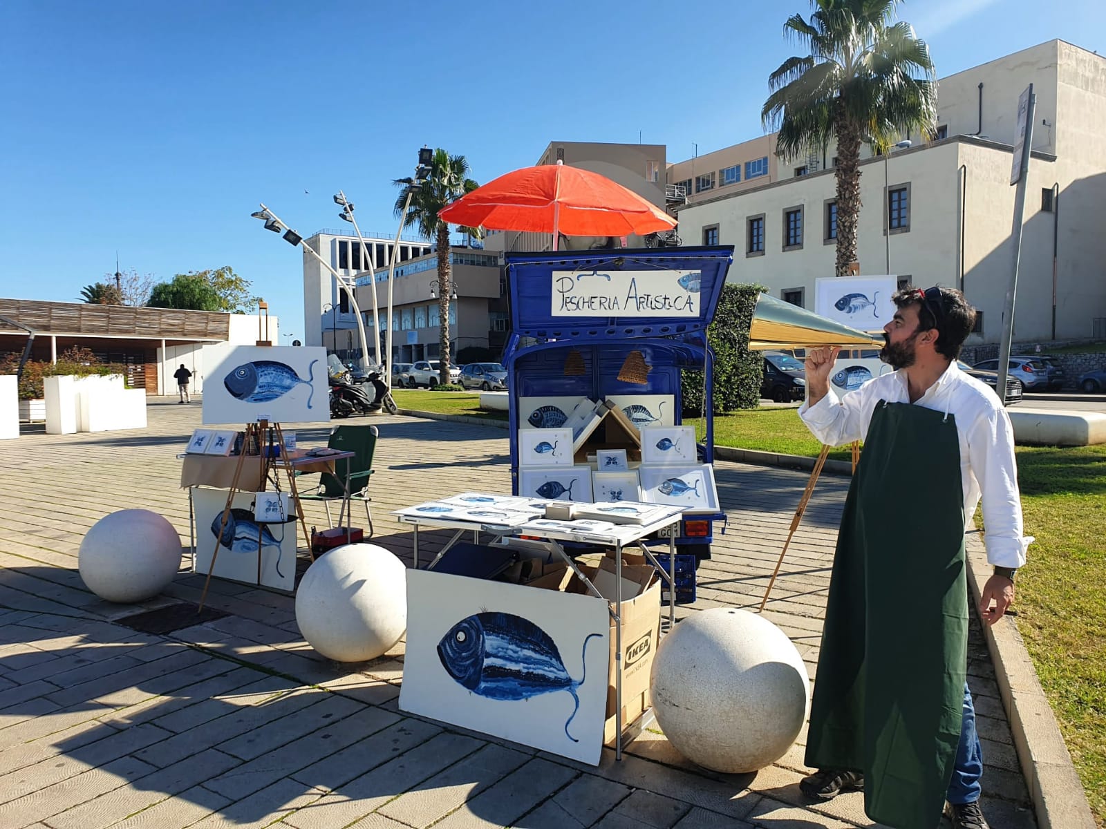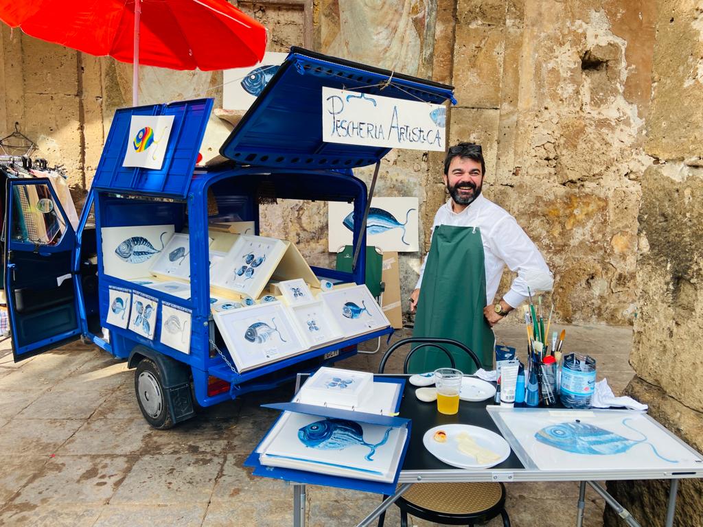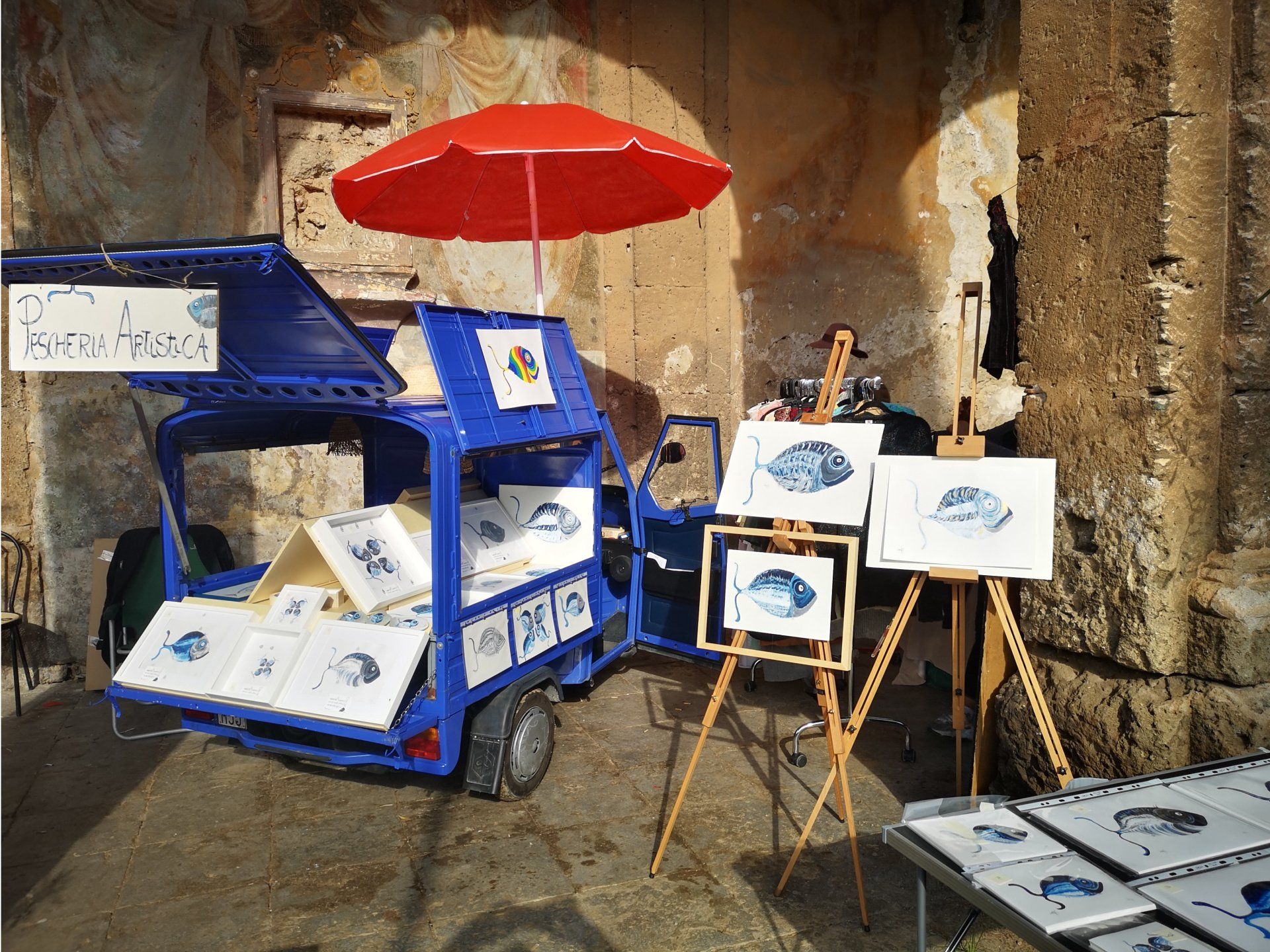 I quadri della Pescheria Artistica 'Mpare sono gli elementi d'asporto di una installazione ambulante fatta di grembiule, megafono, voce, gesti, ghiaccio finto, bilancia, ombrellone e Lapìno.